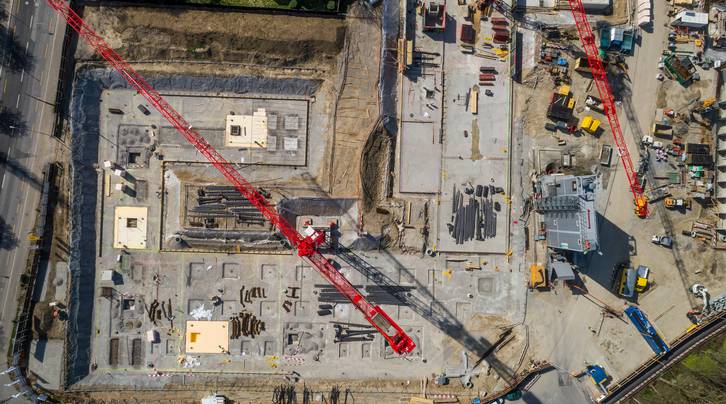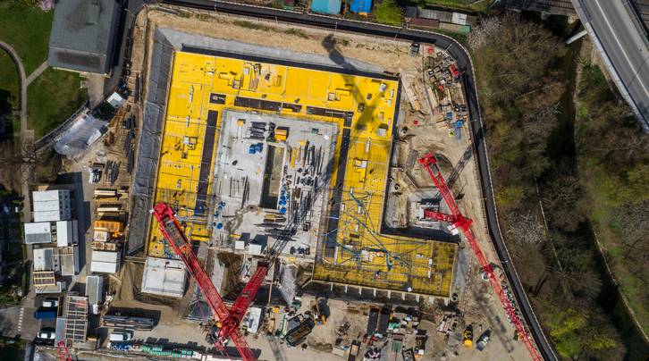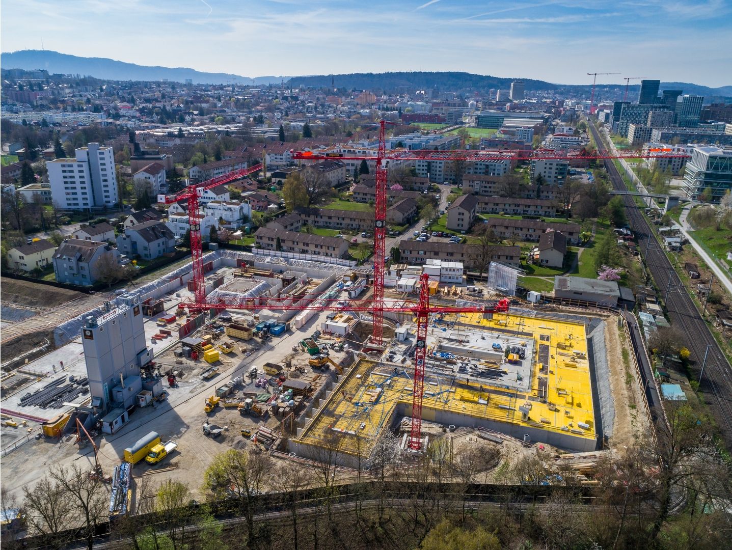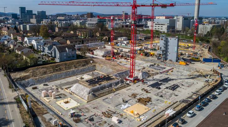 Aktuell wird rund um die fünf Kranen mit je einem Team von 15 Mann gearbeitet. Parallel und Hand in Hand geht es auf den drei Baufeldern vorwärts. Dem zuständigen Polier obliegt die massgeschneiderte Arbeitsvorbereitung und minutiös abgestimmte Logistik: So wird im Bereich der Wallisellenstrasse zurzeit der Tiefgaragenboden vorbereitet, Armierungseisen werden verlegt, Schläuche für Elektroinstallationen gelegt, Kellerwände für Betonarbeiten geschalt und Türen ausgespart. Im hinteren Teil nahe der Bahnlinie entstehen auf dem bereits fertigen Kellergeschoss die Räume zum Doppelkindergarten im Erdgeschoss. Das für die eigene Betonanlage nötige Kies und Zement wird jeden Tag neu angeliefert. Hier weiss jeder, wo wann was zu tun ist. Ebenso vorbildlich ist die Ordnung und Sauberkeit auf der Grossbaustelle. Professionalität wird bei der ASIG gross geschrieben.