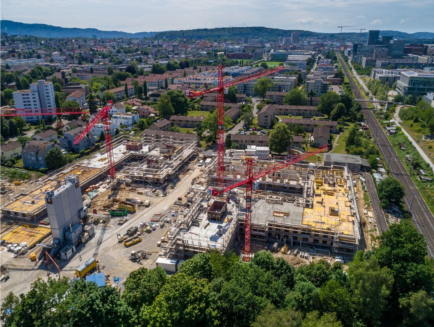 Der aktuelle Blick auf die ASIG-Grossbaustelle Am Glattbogen zeigt, dass das Erdgeschoss in allen drei Häusern abgeschlossen ist.