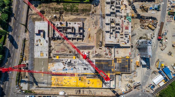 Vorne entlang der Wallisellenstrasse werden erst noch Hinterfüllungen gemacht. Diese bilden die Basis für Fassade sowie Gerüst und verhindern spätere Absenkungen. In Angriff genommen werden sie jeweils, sobald die Decke über dem Keller im Untergeschoss tragfähig ist. Die durch den anfänglichen Aushub entstandene Böschung (Keil) wird dabei mit einem Gemisch aus Sand und Kies schichtweise gefüllt und durch den Einsatz einer ferngesteuerten, vibrierenden Walze verdichtet. So wird die Qualität der Umgebung langfristig sichergestellt.