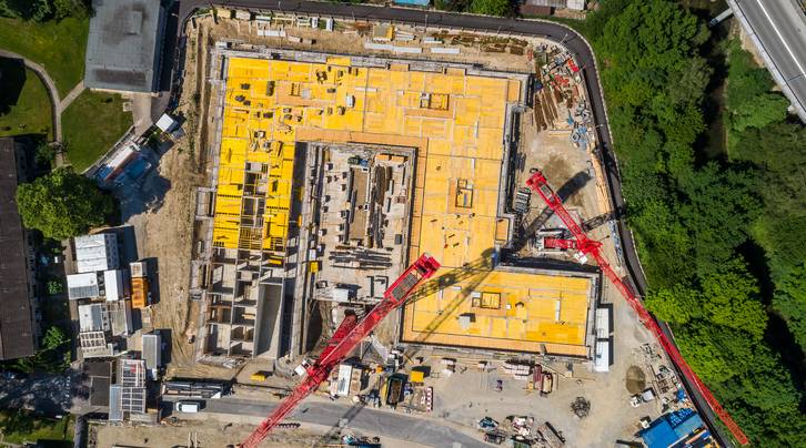 Nun aber der Reihe nach: Im hinteren Teil des Baufeldes liegen zur Hälfte die Decken über dem Erdgeschoss und die ersten Wände werden betoniert. Nicht weniger als 9‘000 m3 Beton wurden bis heute eingebaut. Die gemauerte Fassade umgibt ein Baugerüst, welches nun Geschoss um Geschoss in die Höhe mitwächst.