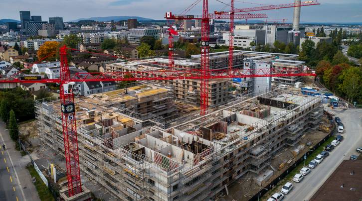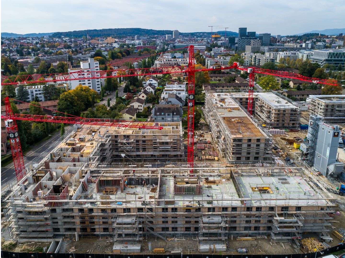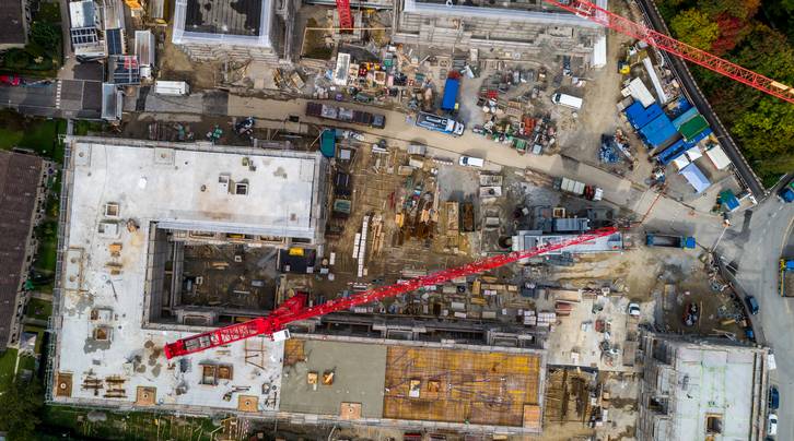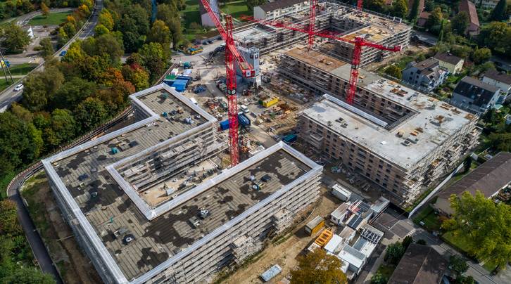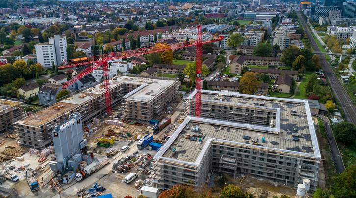 Mit dem Herbst verschwinden zwei weitere Kranen auf der ASIG-Grossbaustelle Am Glattbogen. Einzig im Haus C entlang der Wallisellenstrasse werden noch Treppenhäuser, Wände und Decken betoniert.