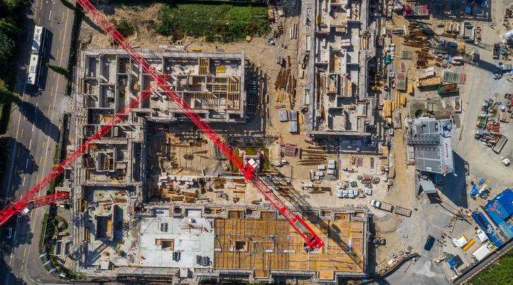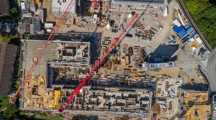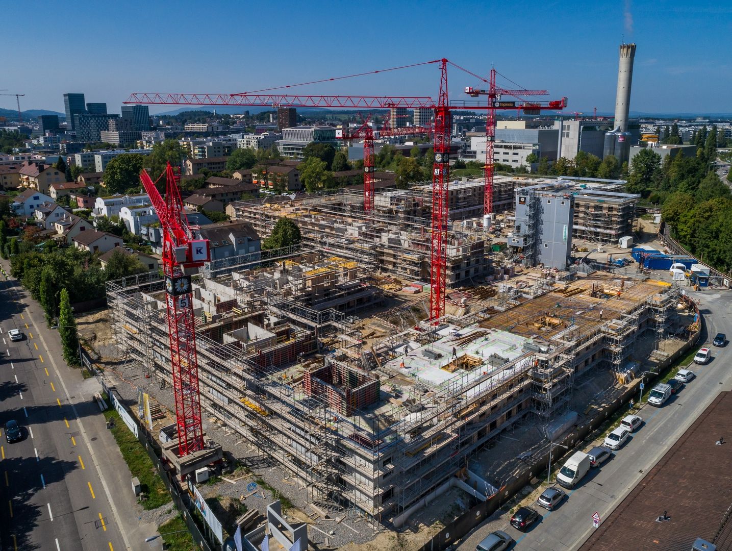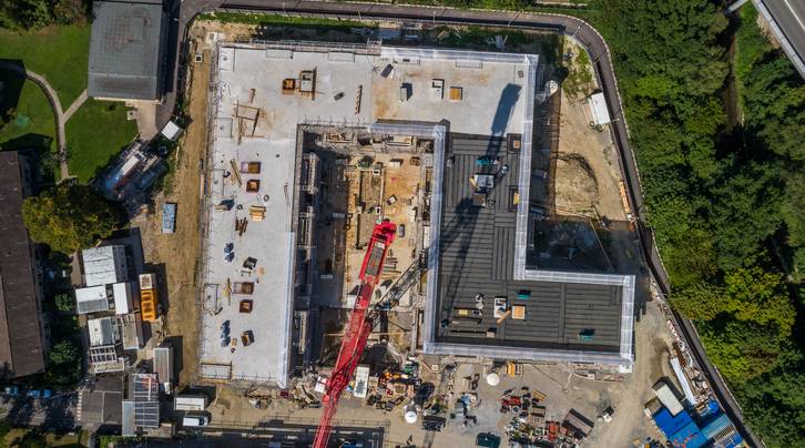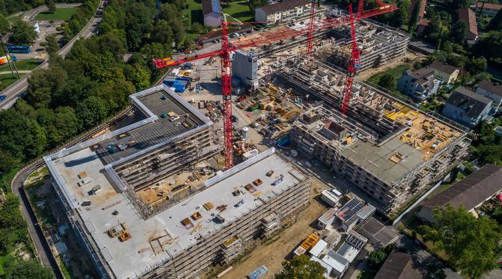 Die eigene Betonanlage vor Ort leistet Grosses. Darum ist jetzt während zwei Wochen Revision angesagt. Kein Grund zur Sorge, denn in dieser Zeit wird der fixfertige Beton einfach angeliefert. Was weiter auffällt ist, dass einer von fünf Kranen bereits abgezogen werden konnte. Im hinteren Bereich der Grossbaustelle ist nämlich der Rohbau bereits abgeschlossen und im Oktober wird pünktlich Aufrichte gefeiert. Hier wird im Untergeschoss nun die Zentrale der anspruchsvollen Haustechnik erstellt. Mit den Sanitär, Heizungs-, Lüftungs- und Elektrik-Teams, welche sich um die Rohinstallationen kümmern, steigt auch der Personalbestand auf dem Platz.