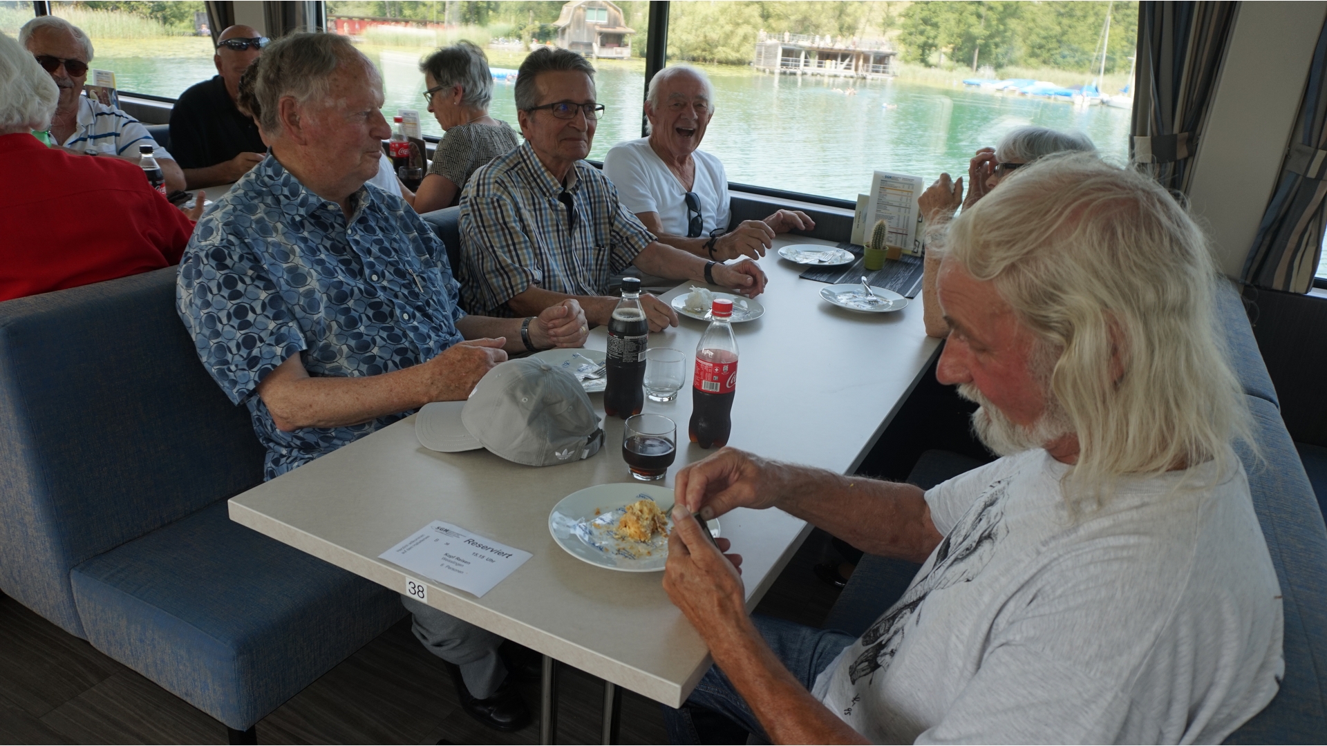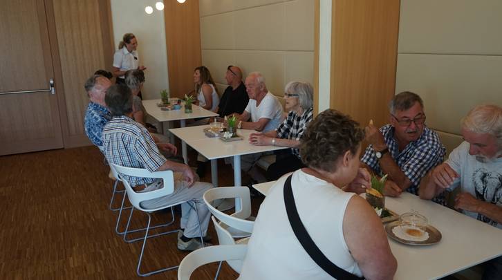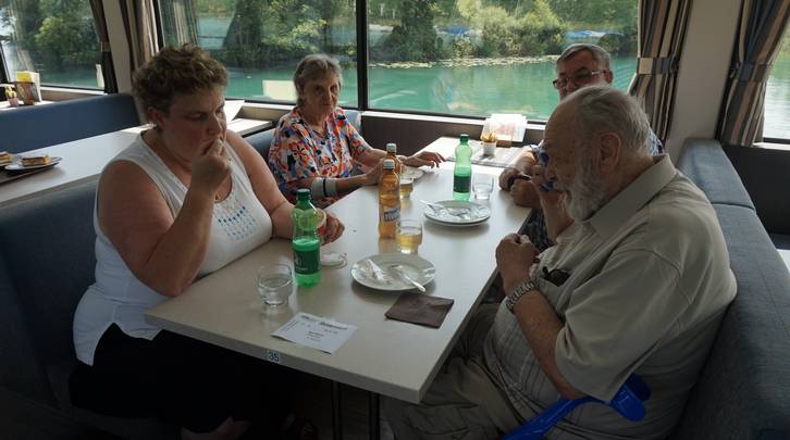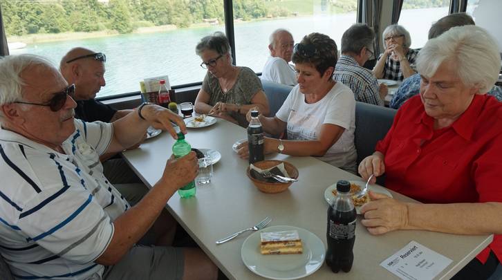 Die Weiterfahrt führte uns Richtung Sempach ins Restaurant zur Schlacht. Ein feines Mittagessen erwartete uns und alle begrüssten die Platzierung im kühleren Innern des Restaurants. Frisch gestärkt fuhr uns der Chauffeur anschliessend an den schönen Hallwilersee. Als nächstes Gefährt wartete das Schiff auf uns. Bei Crèmeschnitte und Kaffee genossen wir die einstündige Fahrt mit herrlichem Panorama. So manch einer wäre wohl liebend gern ins kühle Nass gesprungen…
