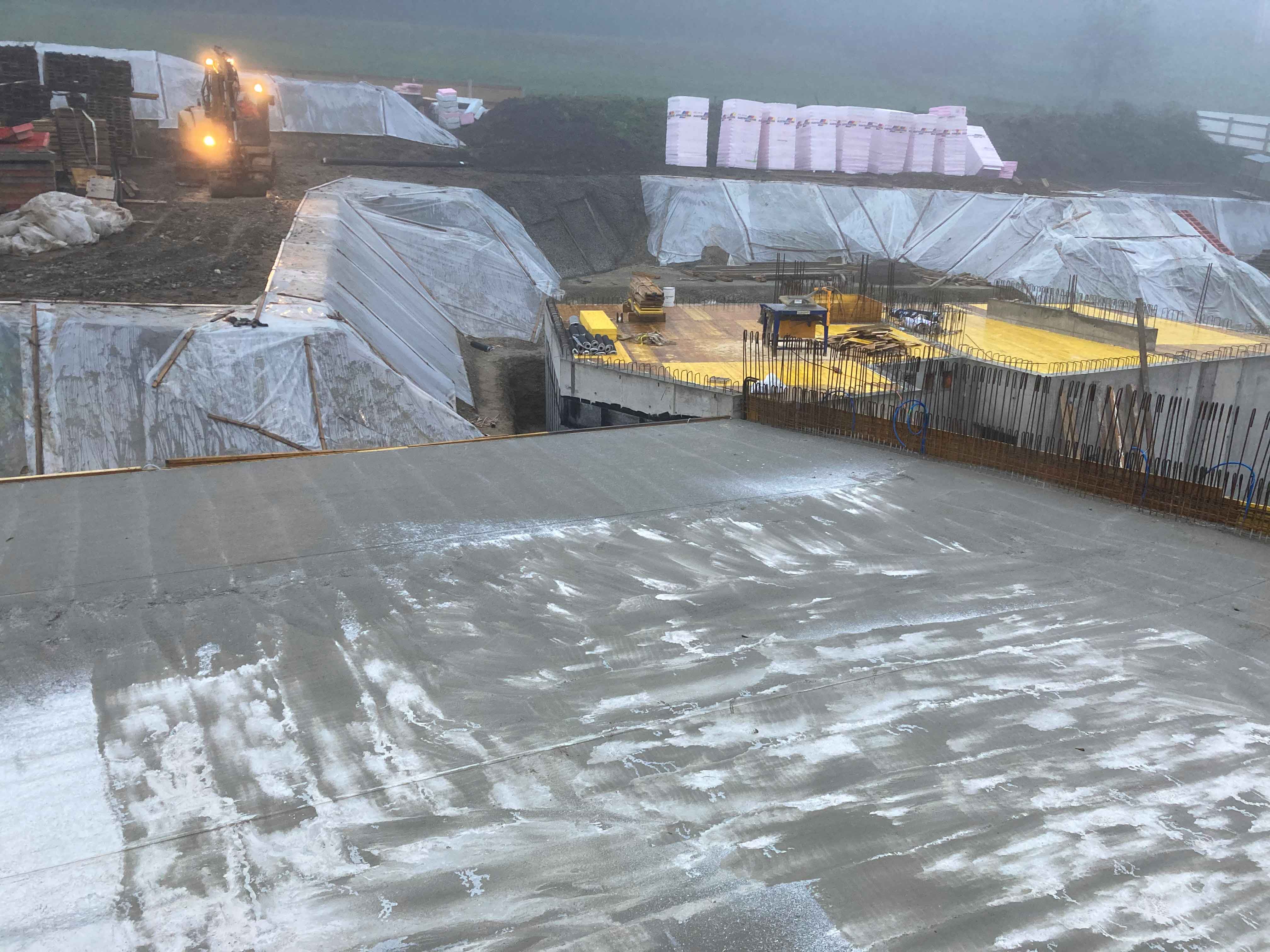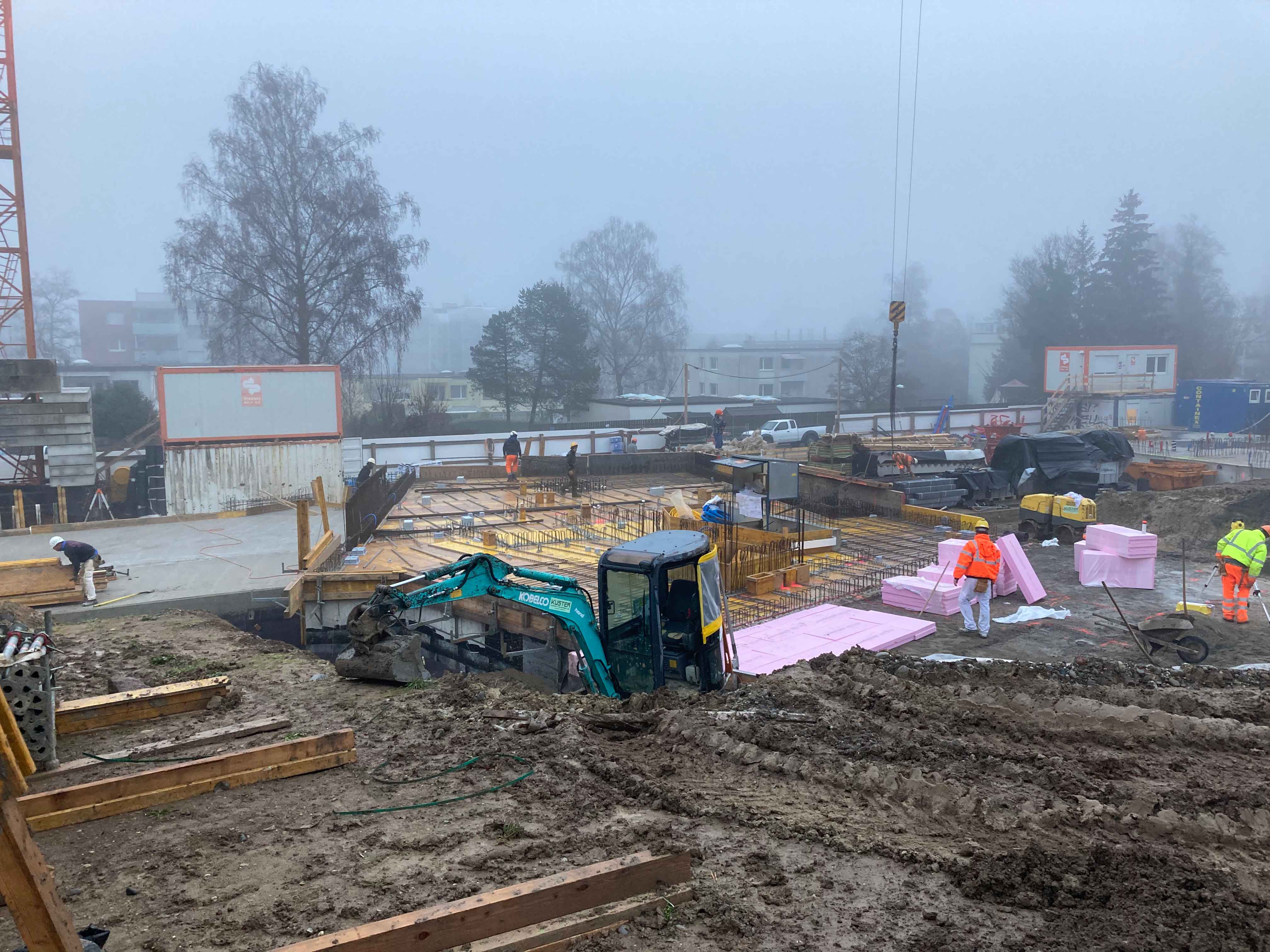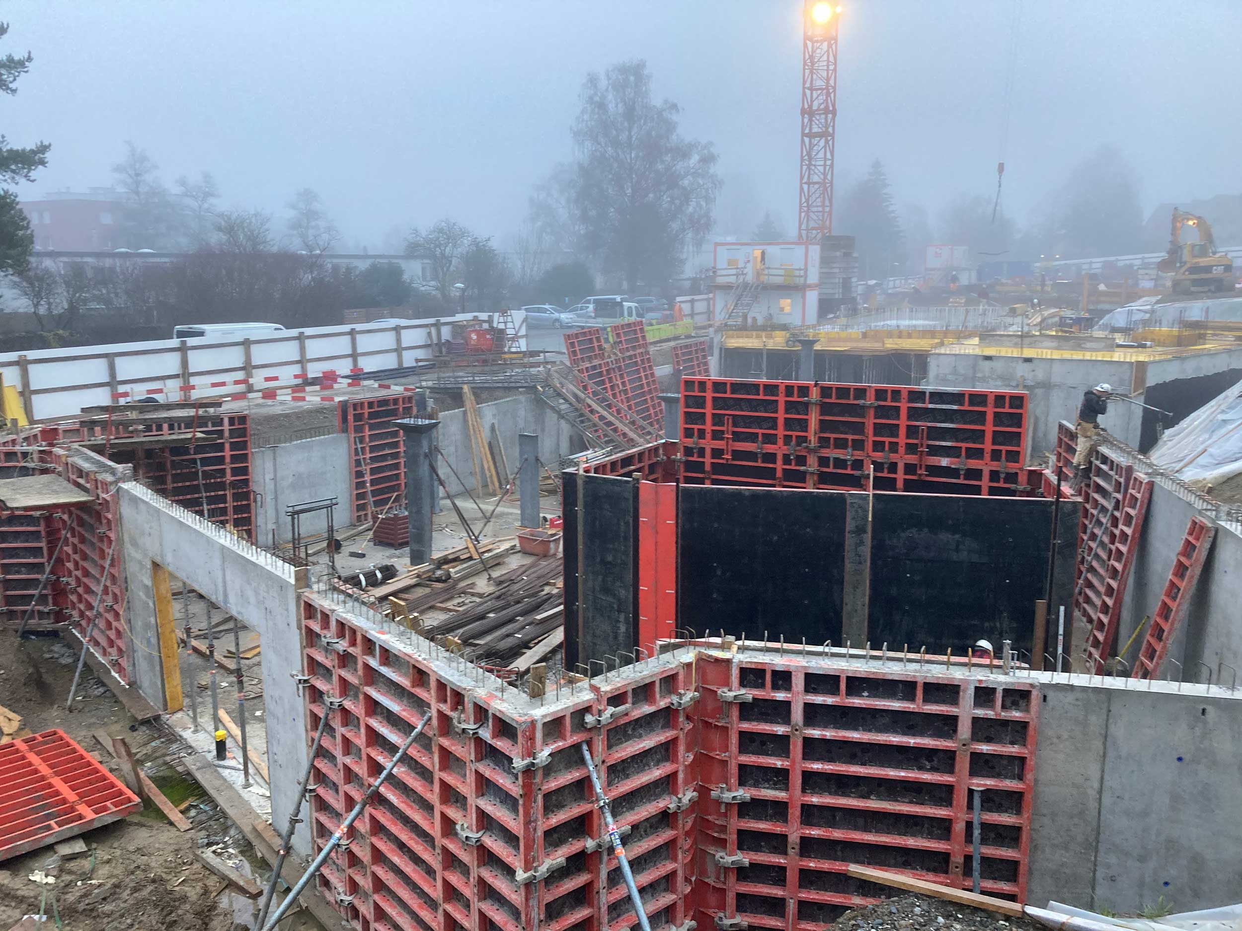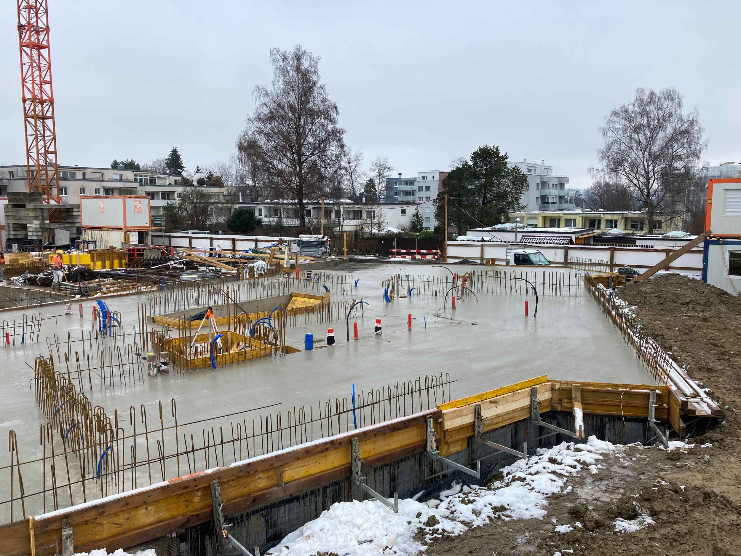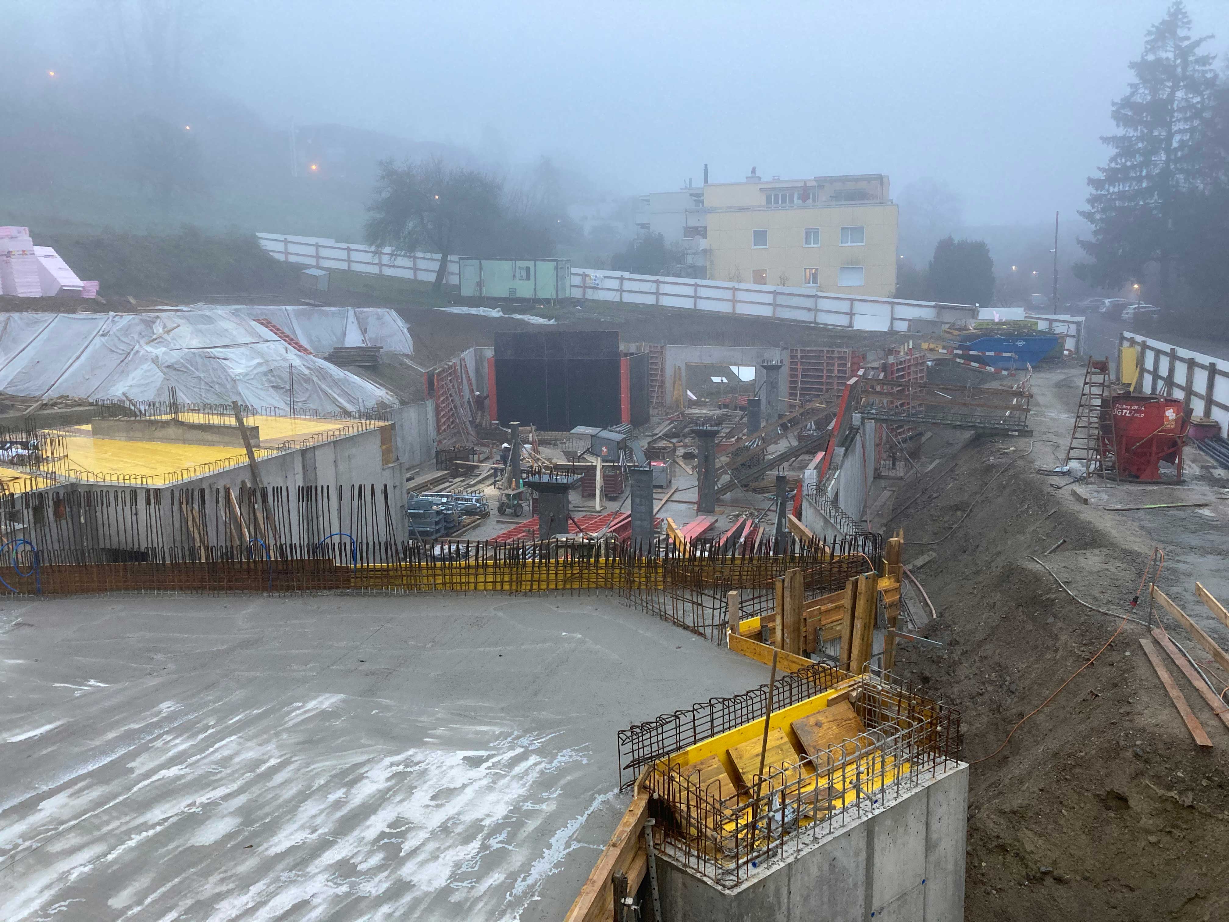 In der Einstellhalle und im Kellergeschoss entstehen Wände, während die ersten Decken bereits betoniert sind, Wo nötig, wird die Wärmedämmung unter der Bodenplatte verlegt und Leerrohre für die Elektrik sowie Einlagen für Lüftungs- und Sanitärinstallationen montiert. Die Baustelle wurde mit einer Bauwand eingefasst und der Baustellenaufritt sorgt mit der «Langäri»-Visualisierung samt Logo zur neuen ASIG-Siedlung bereits für Vorfreude.