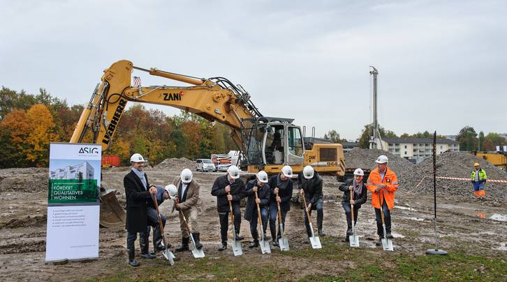 Am Dienstag, 25. Oktober 2016, haben die ASIG Wohngenossenschaft, Implenia und Vertreter von pool Architekten, der Stadt Zürich sowie weitere Gäste den Startschuss für den Ersatzneubau «Am Glattbogen» gefeiert. Mit diesem symbolischen Akt beginnen die Bauarbeiten für neuen nachhaltigen und bezahlbaren Wohnraum im Zürcher Stadtteil Schwamendingen. Im östlichen Teil des Glattbogens werden 229 Wohnungen realisiert. Diese ersetzen 115 bestehende Wohneinheiten, die nicht mehr den heutigen gesellschaftspolitischen und städtebaulichen Vorstellungen entsprechen. Die neuen vier- und siebengeschossigen Gebäude werden nach Minergie-Standard erstellt und erfüllen die Ansprüche an verdichtetes Bauen. Neben Mietwohnungen entstehen im Neubau ein Doppelkindergarten, ein grosser Gemeinschaftsraum sowie rund 400 m2 Gewerbefläche. Die Abbrucharbeiten der alten Überbauung stehen kurz vor Abschluss. Danach werden die Aushubarbeiten durchgeführt, sodass im Januar 2017 mit den Baumeisterarbeiten gestartet werden kann. Im Sommer 2018 werden voraussichtlich die ersten Mieterinnen und Mieter ihr neues Zuhause einziehen können.