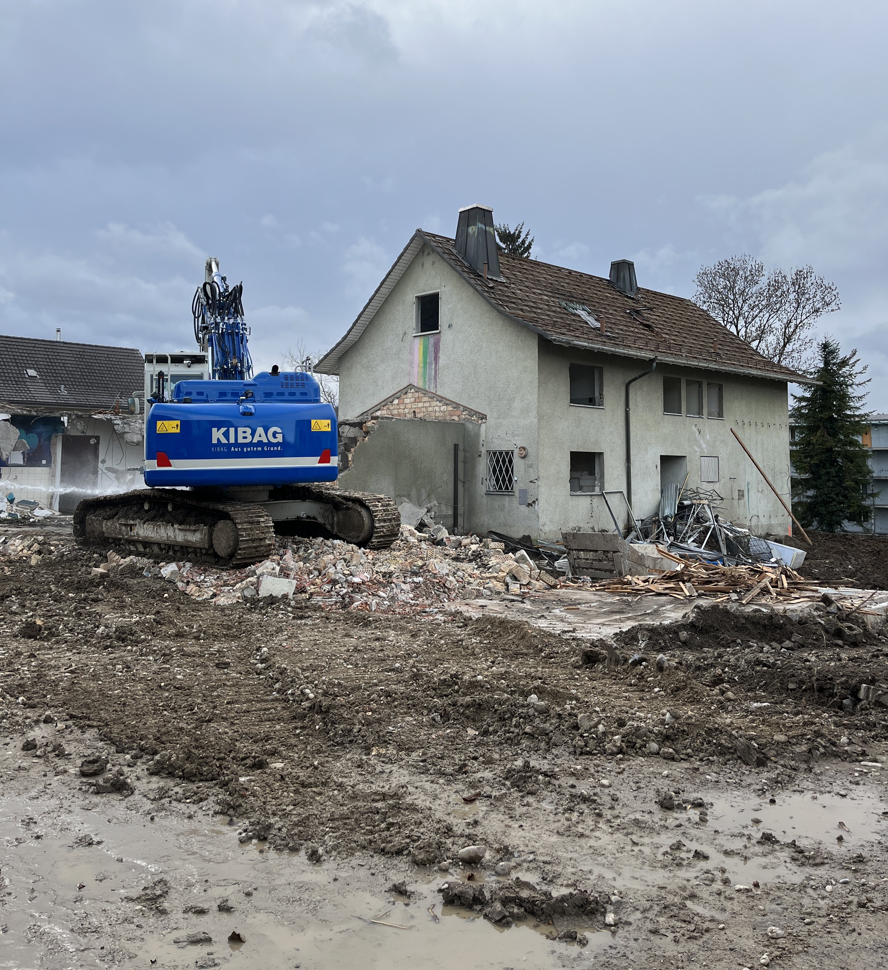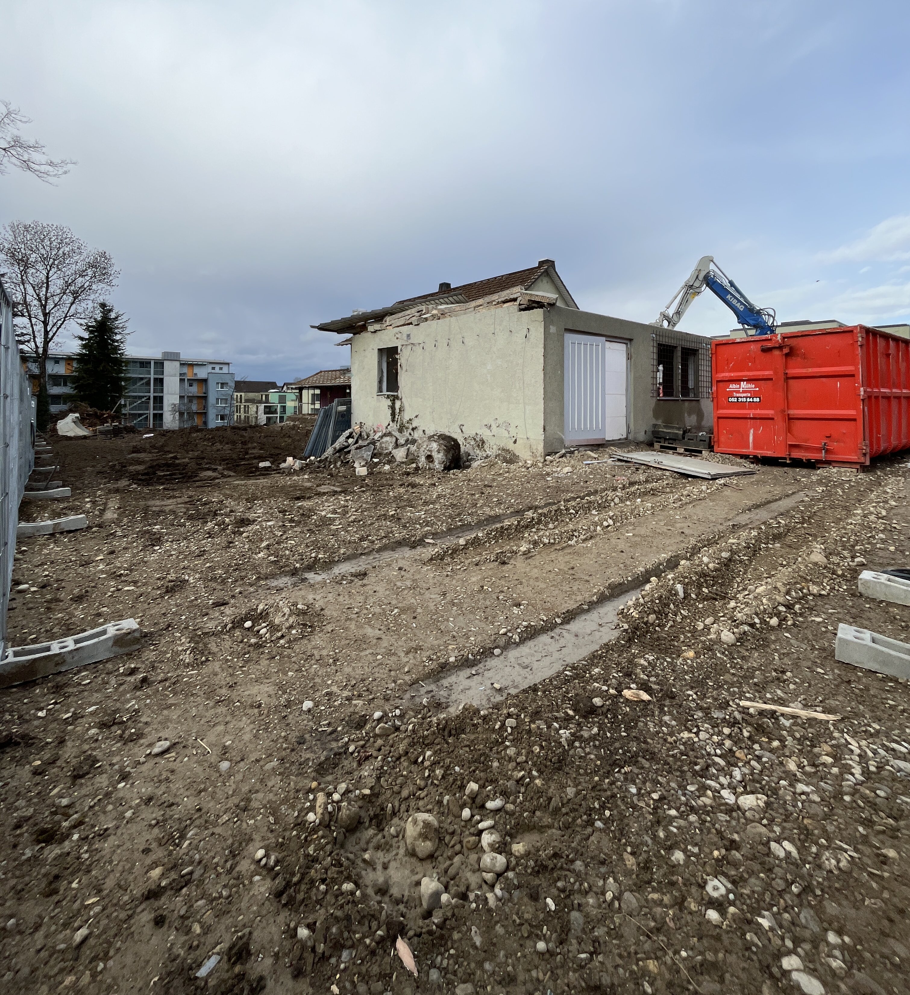 Bevor Neues entstehen kann, muss Altes weichen: Aktuell wird das bestehende Gebäude an der Grundstrasse 11 zurückgebaut, um Platz für die kommenden Neubauten zu schaffen.